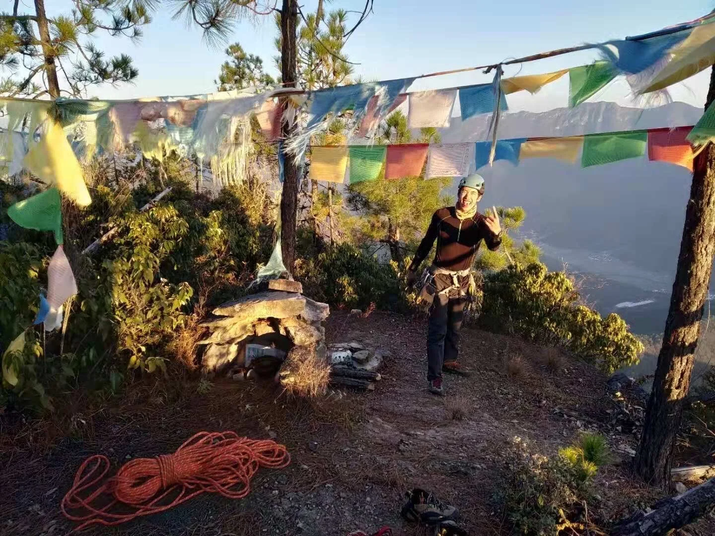 Dane and I solo the final pitch of Allegory of the Caves to discover the mountain has a back way up that leads to a local shrine at the summit, a pilgrimage for local Bai and Naxi people who live in the valleys below.