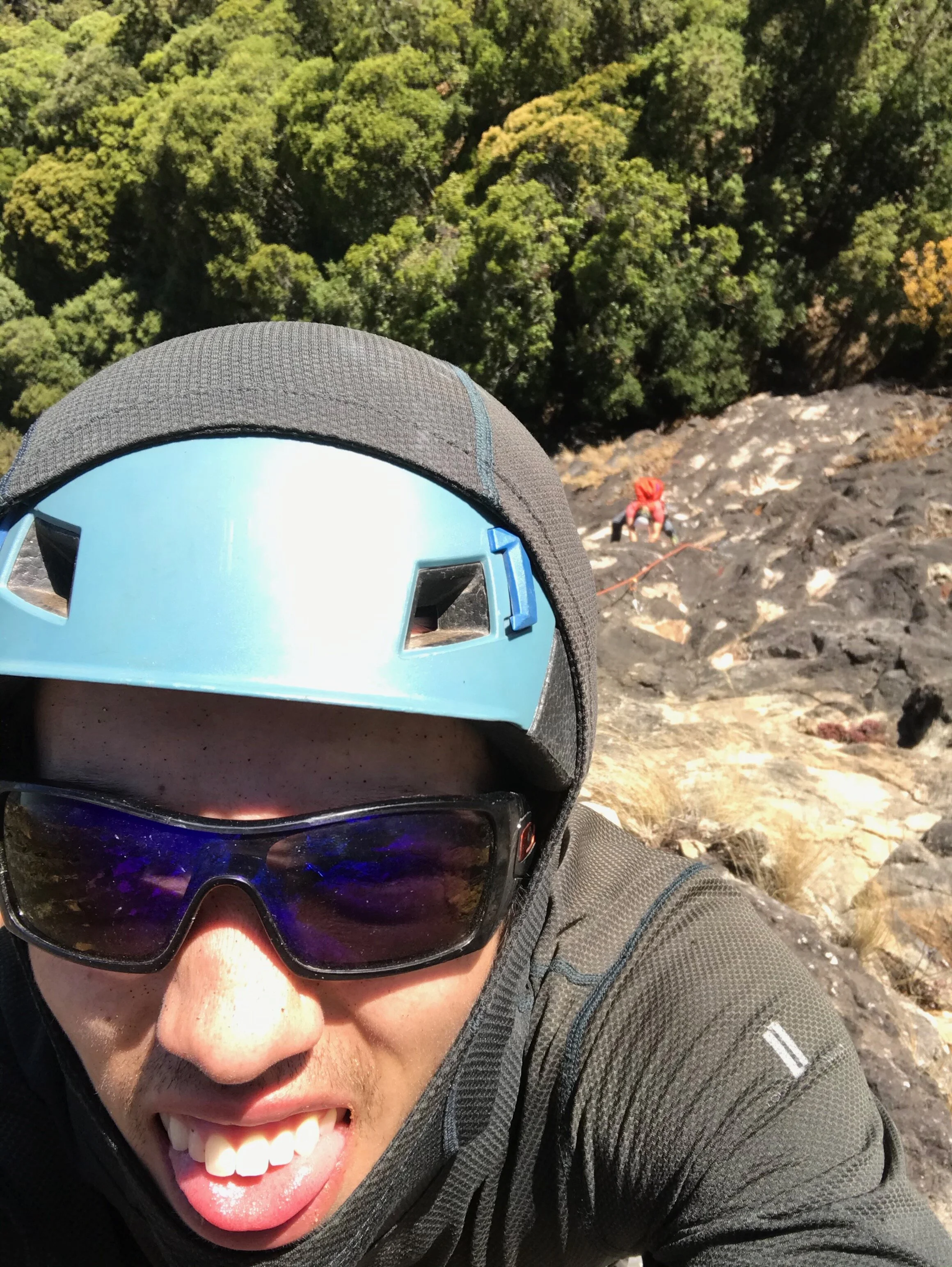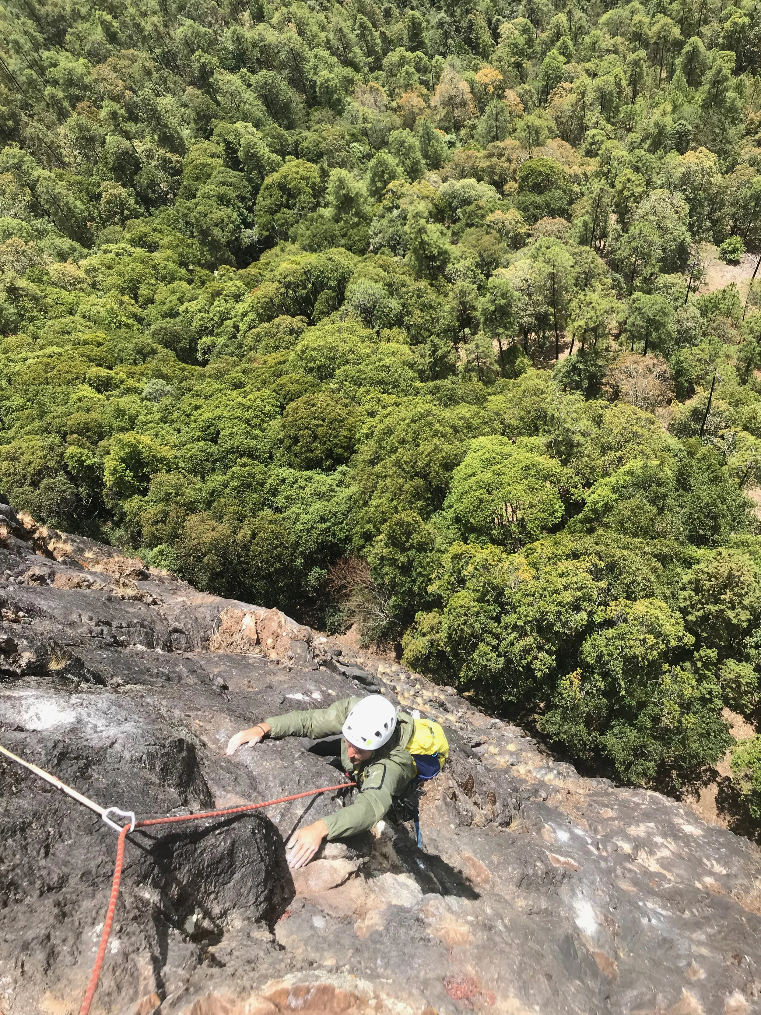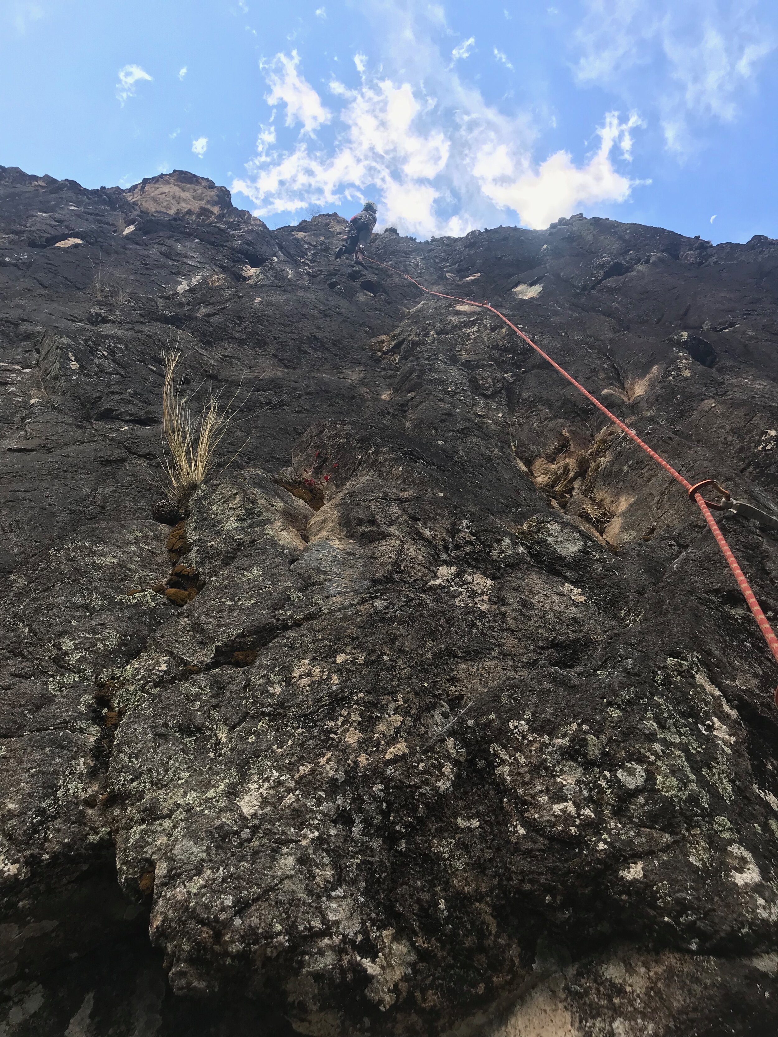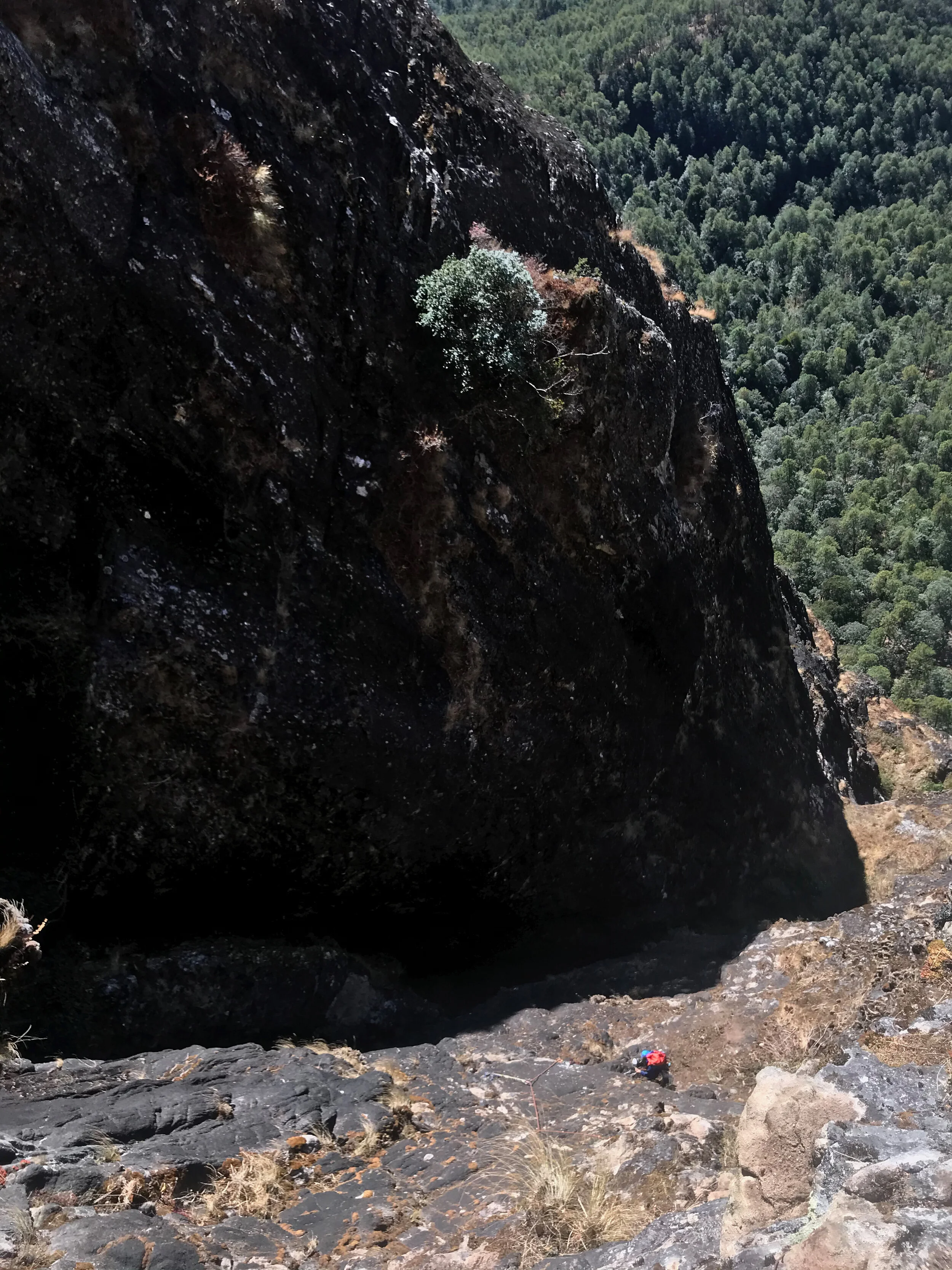 I packed up the anchor station and charged up the pitch as fast as I could. I followed the rope, watching the rock and for a short stretch and get replaced by a combination of boulders and dirt. The rock reappeared right as Dane came into view. I looked past him and realized what he meant by “crazy.” His belay was a small tree at the beginning of a large terrace. The terrace itself was covered in thick bushes and tress with another wall rising up on its far end.