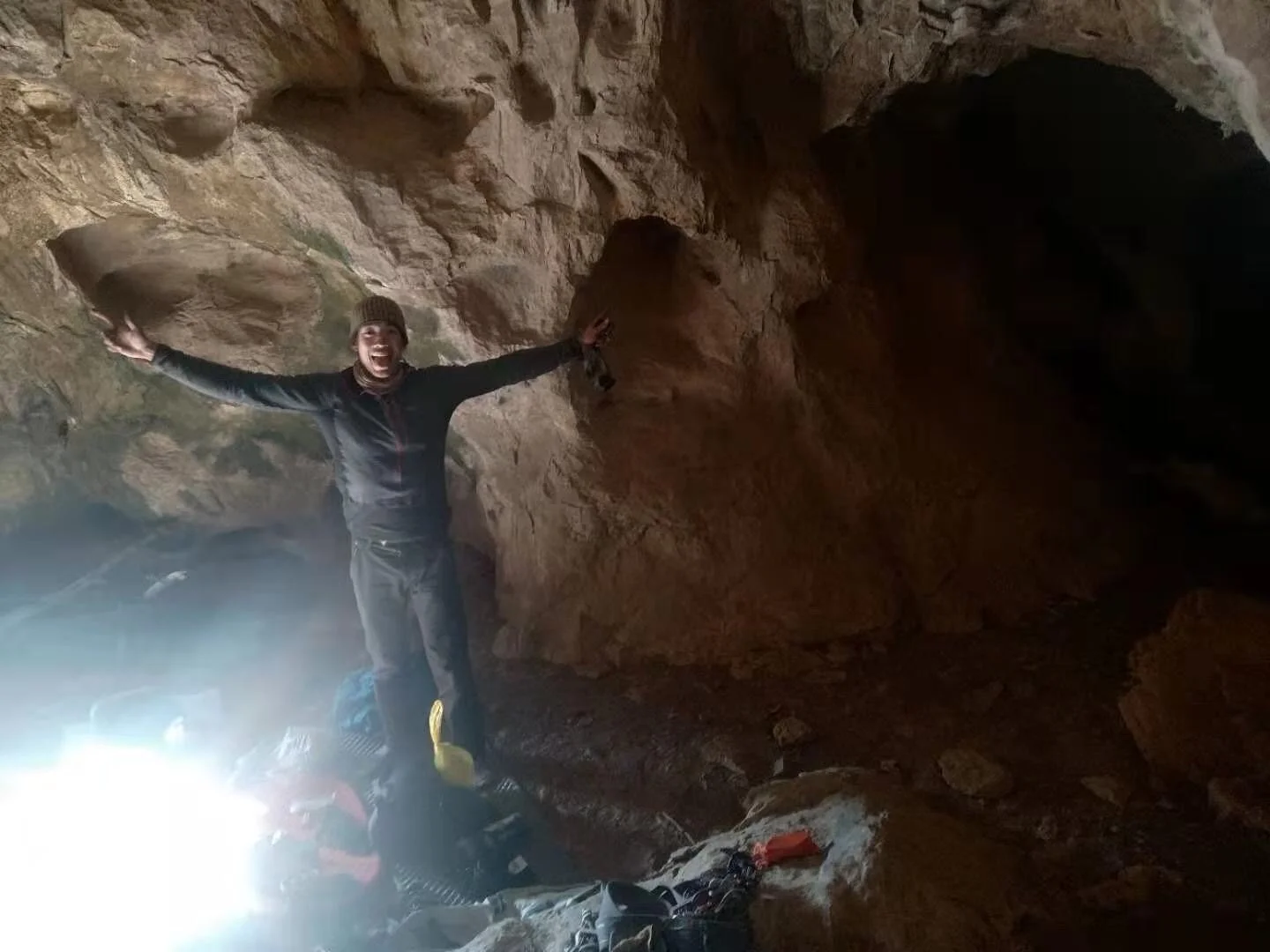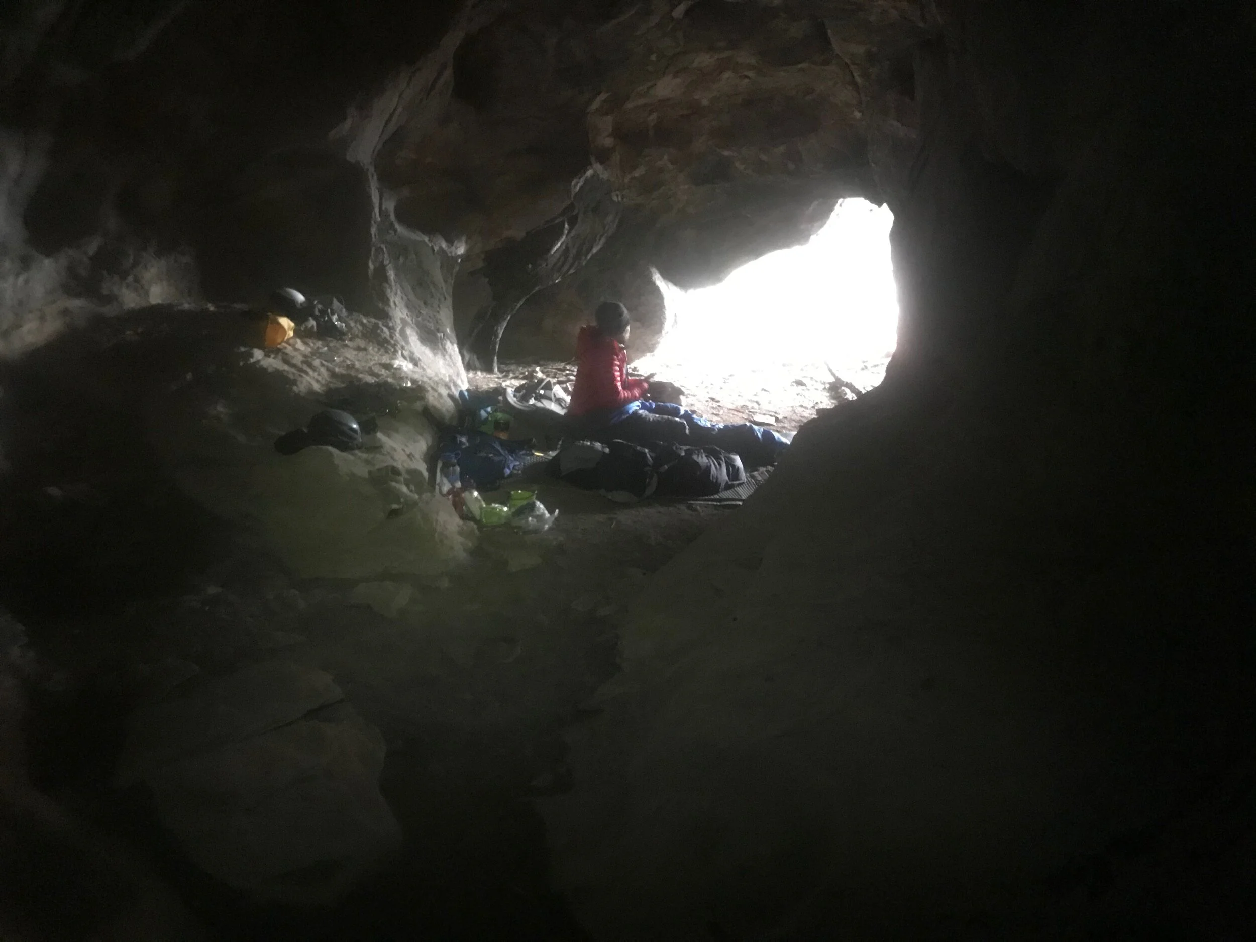 By halfway through the dense loaf of banana bread, we were stuffed, and we lumbered over to our gear. Suited up, we headed back out to the entrance of the cave as sunlight lit up the entire face and began warming the air around us.