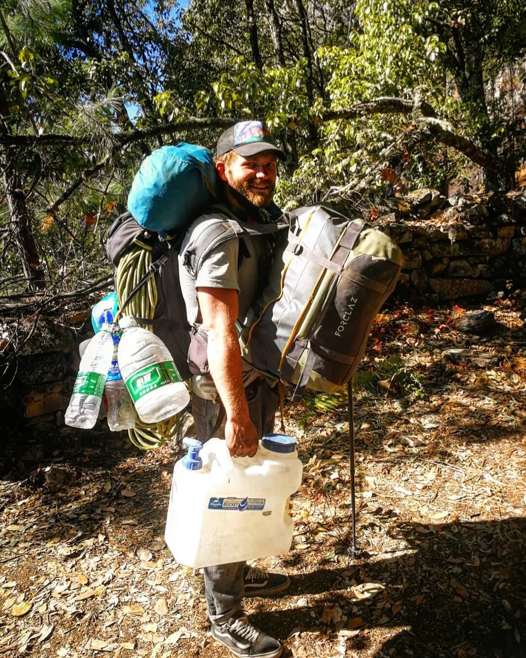 The gear lay scattered in the dirt around the van like a bomb had gone off inside: a dozen lengths of stainless steel chain, 40 maillons, trad gear, two drills, batteries, fresh food supplies, two blocks of butter, camping gear, whiskey... The list in my notebook grew as I kept turning pages to add more items to the list. I began doing the rough math in my head. 100… 200… kilograms? Maybe more. We loaded everything into our largest bags. Dane squatted down and grabbed his 75-liter pack and tried dead-lifting it up onto his knee.